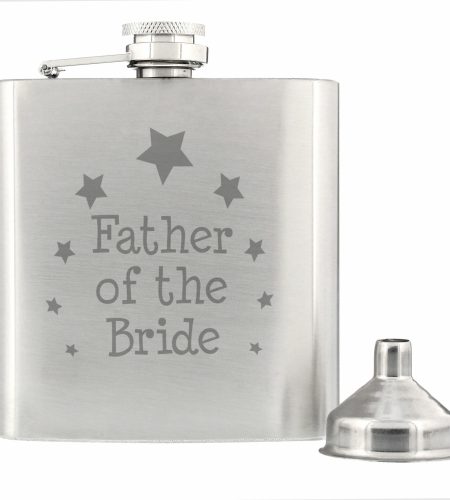 This 6 oz. stainless steel Hip Flask comes with the wording ‘Father of the Bride’ featuring a stars motif as standard.